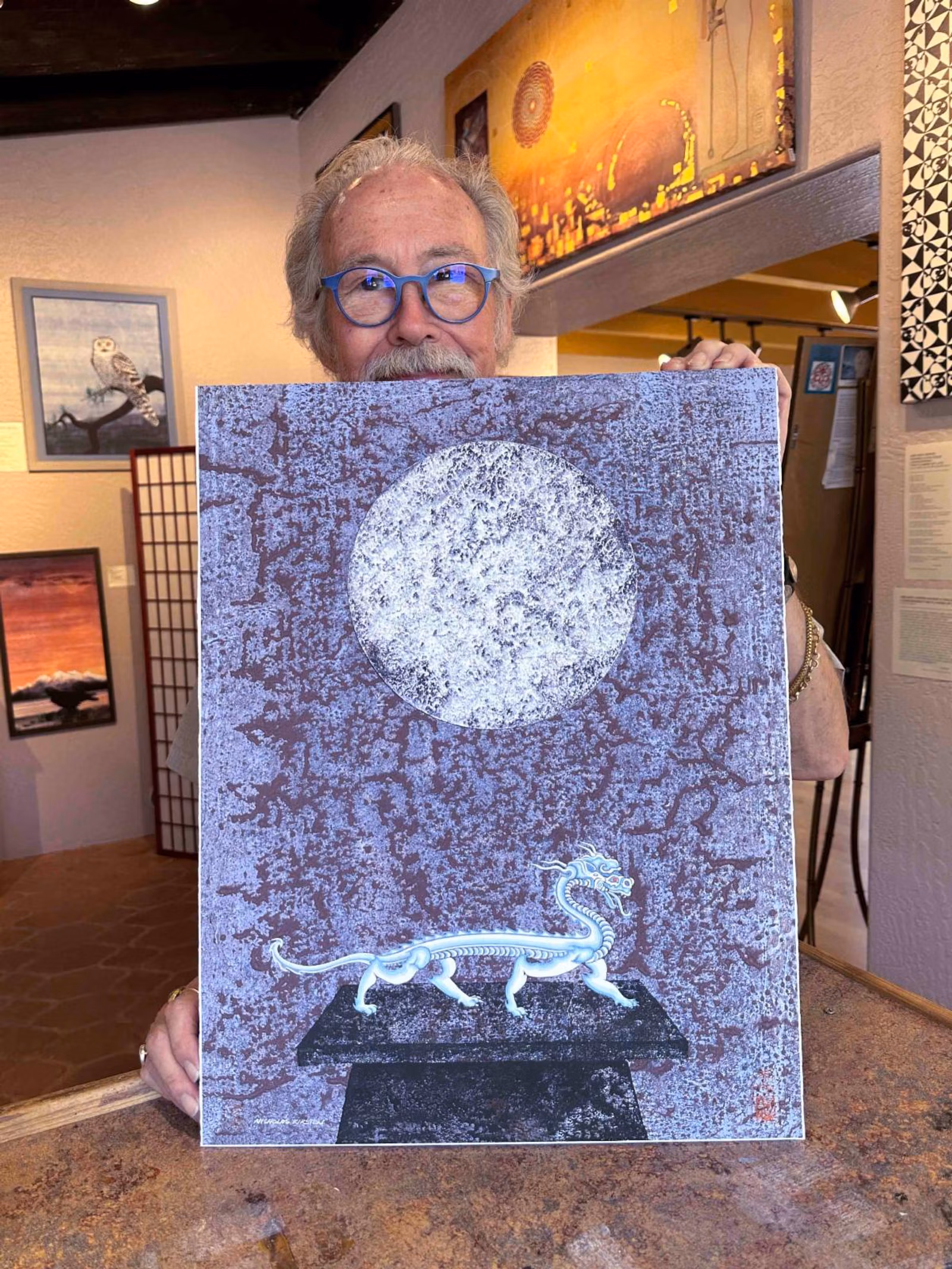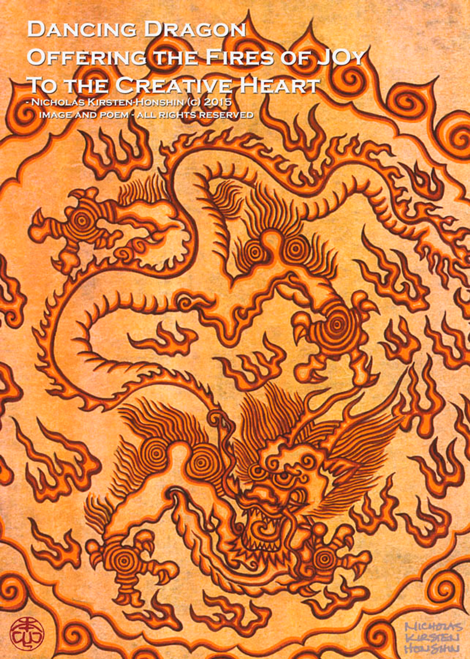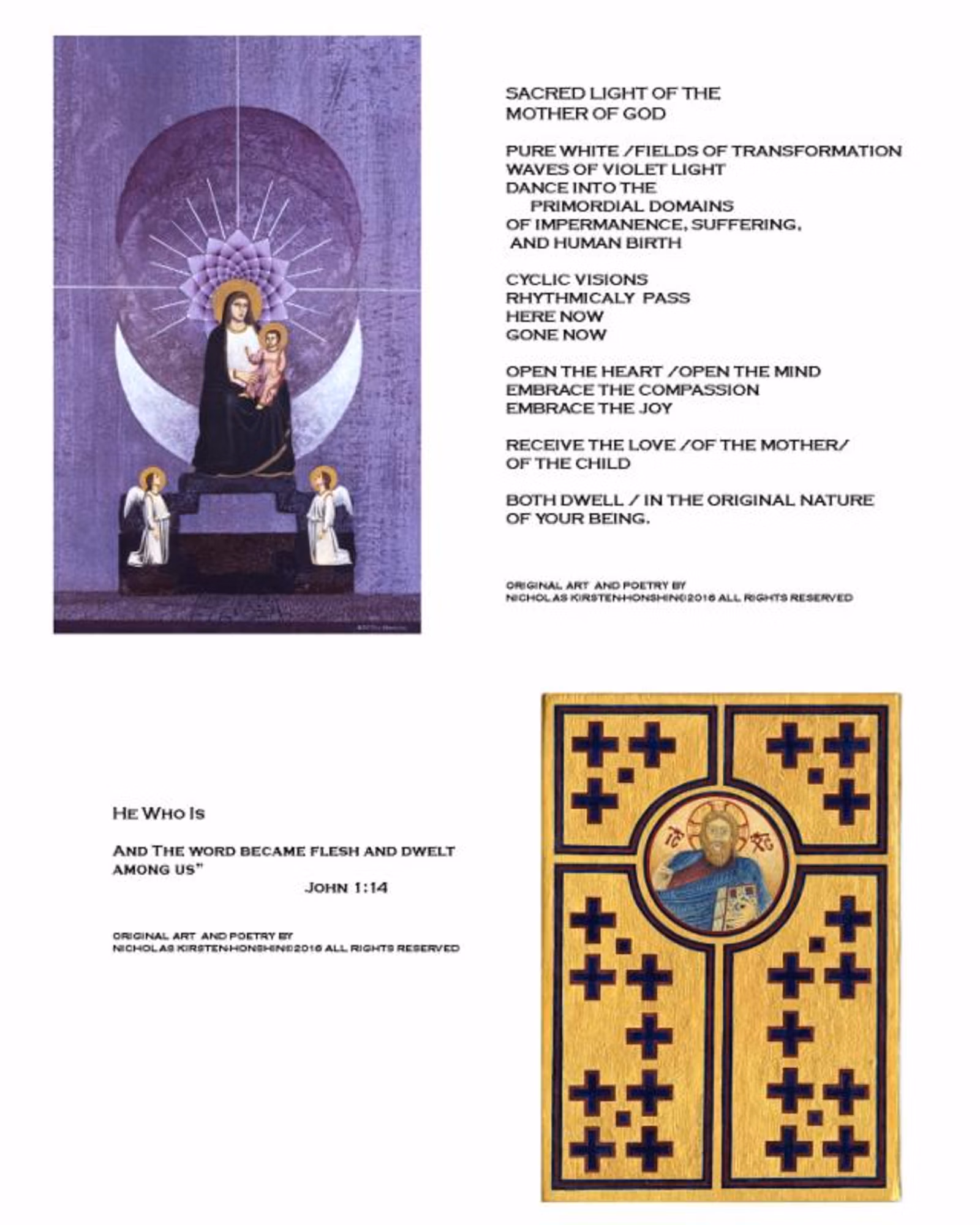Nicholas Kirsten-Honshin’s art and poetry are a reflection of his experience with ancient Eastern spiritual practices and the philosophies of Christianity, Tibetan Buddhism, Zen Buddhism, and ancient Mesoamerican cultures. His work is a mythic amalgamation of ancient healing practices and the present trends in spirituality, science, and nature, resulting in a true fusion of East and West. His art is an expression of his personal journey, a mythic amalgamation of ancient healing symbols, practices, and present trends in spirituality, science, and nature. Profoundly influenced by the Northwest Mystic School, a legacy passed to him by his father Daiensai Kuden Bonseki Dojin and the other acclaimed artists of this period whose work he grew up surrounded by, Honshin sees art as a form of spiritual quest. Using painting, printmaking, sculpture, jewelry, and poetry as tools, Honshin’s intention is to communicate the unity of consciousness and life of all things in the universe.”