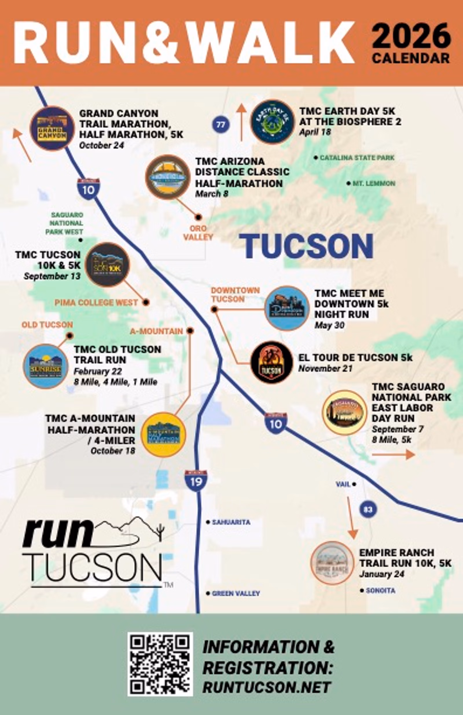 Run Tucson produces exceptional running and walking events, with scenic routes through some of Arizona’s most popular vacation destinations, including the Grand Canyon South Rim area, Saguaro National Park, Old Tucson Studios, the Empire Ranch in Sonoita, the renowned Biosphere 2, and Downtown Tucson. Our events are suitable for all ages and all abilities, with beautiful souvenir shirts and commemorative medals.