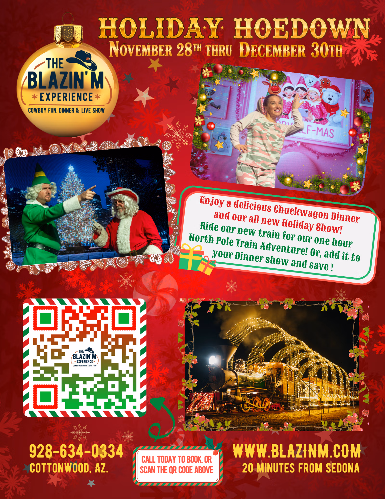 Celebrate the magic of the season at the Blazin’ M Ranch in Cottonwood, Arizona, with TWO festive experiences designed to make your holidays sparkle! Whether you’re in the mood for a cozy train ride through a winter wonderland, a lively dinner and show, or both—you’ll find your holiday home on the range right here.