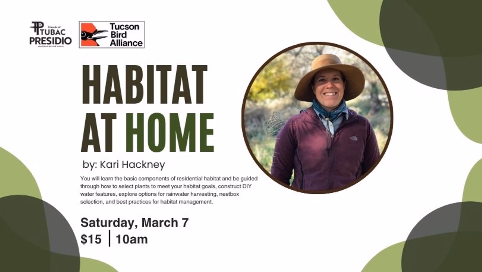 Kari Hackney is the Director of Habitat Stewardship for the Tucson Bird Alliance. She holds her M.S. in Parks and Resource Management, with a B.S. in Biology. She leads the organization’s efforts in habitat restoration, which has both a wildlands and urban focus. As a licensed contractor, she has led habitat installations in residential and community settings. In her presentation, she will detail how to create wildlife habitat in your yard through TBA’s Habitat at Home program. You will learn the basic components of residential habitat and be guided through how to select plants to meet your habitat goals, construct DIY water features, explore options for rainwater harvesting, nestbox selection, and best practices for habitat management.