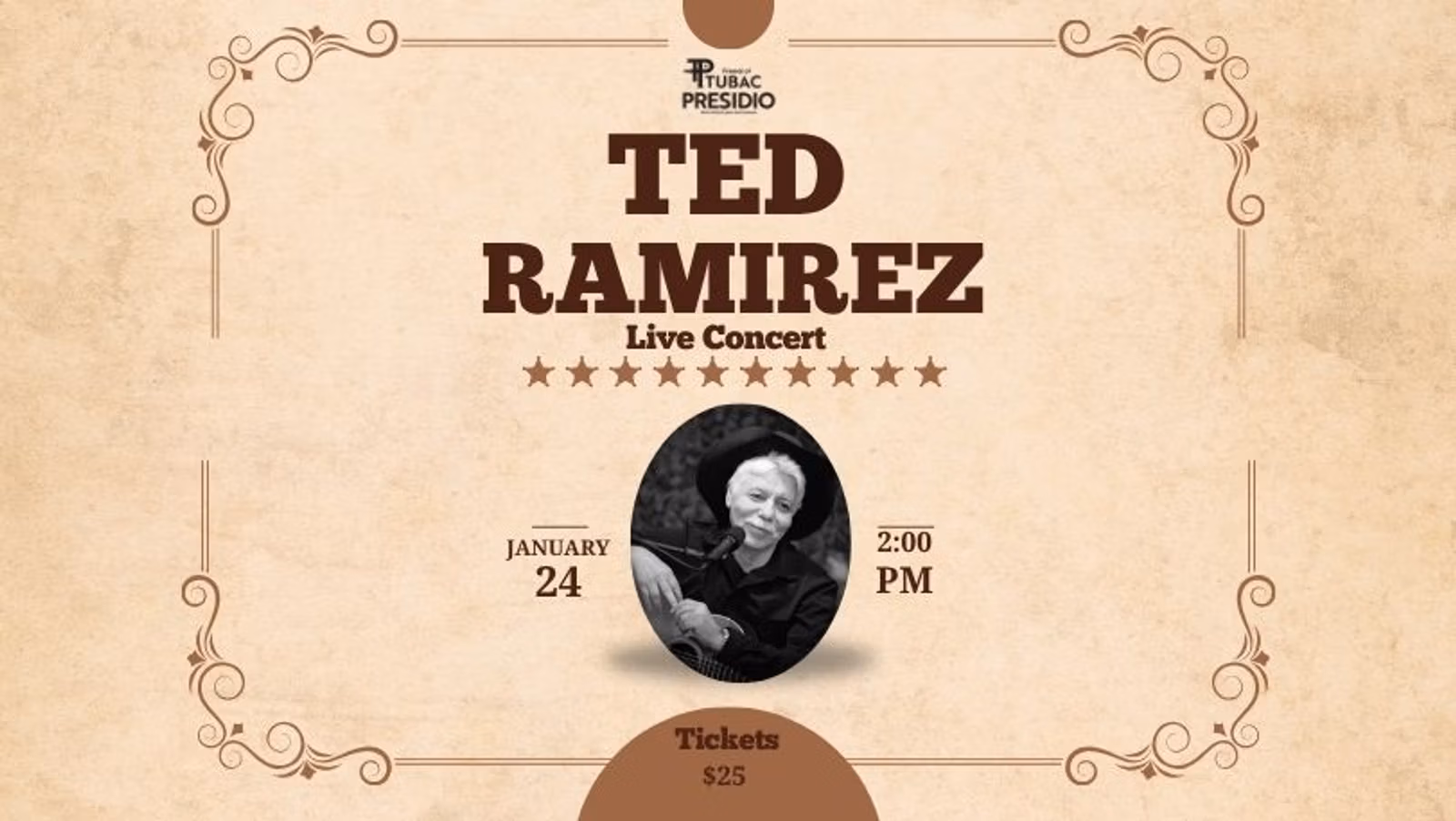 Start the new year with an inspiring afternoon of music at the Tubac Presidio, featuring Ted Ramirez, Tucson’s official folksinger. Through heartfelt ballads and timeless folk traditions, Ted brings the stories, landscapes, and spirit of the Southwest to life. His performances are a journey through history and culture, filled with warmth, humor, and soul.