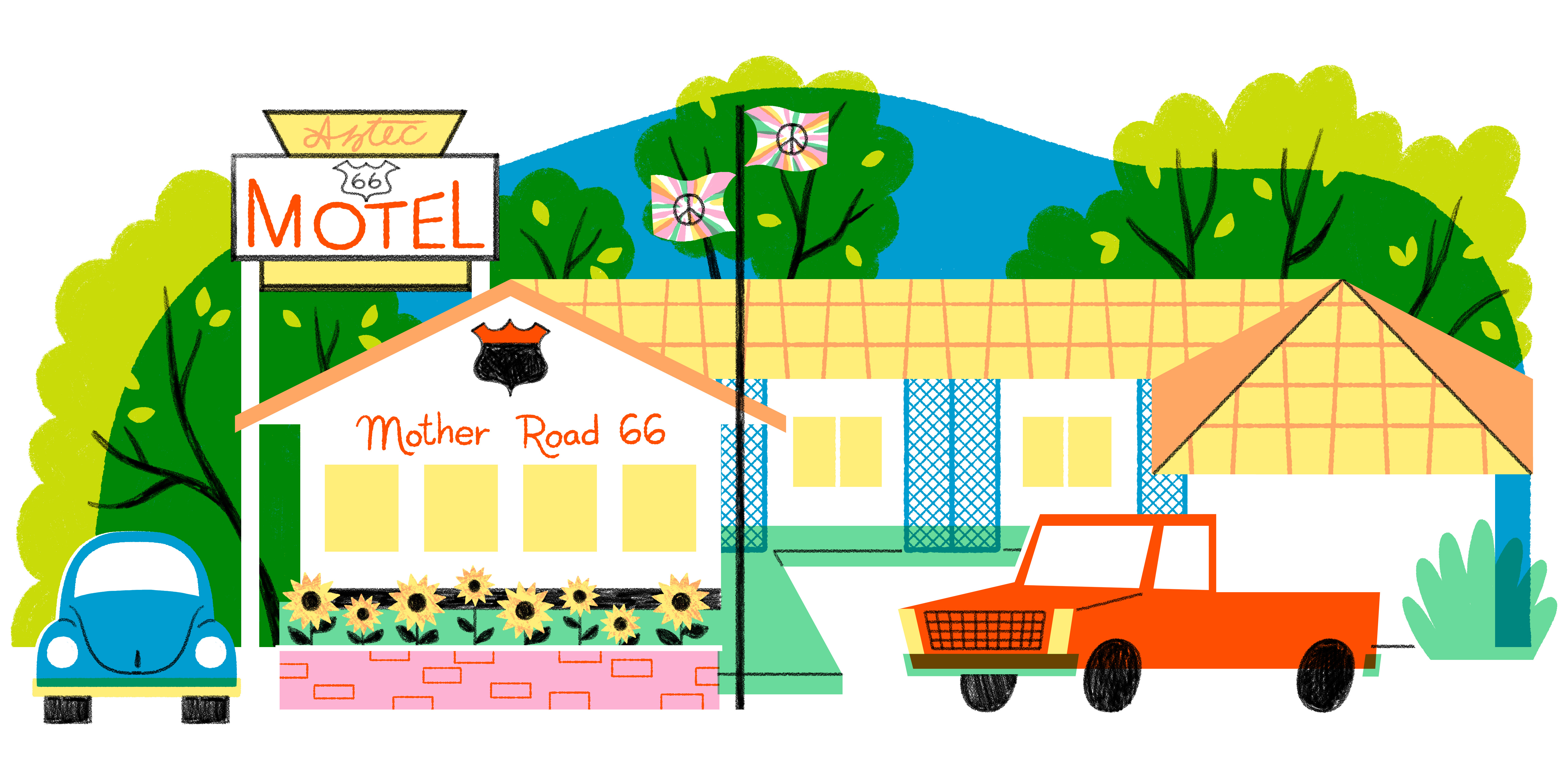 Trailborn is considered the newest accommodations on all of Route 66, a modern-day hub for outdoorsy guests built in 2025 in a refurbished 1960s-era Red Roof Inn.